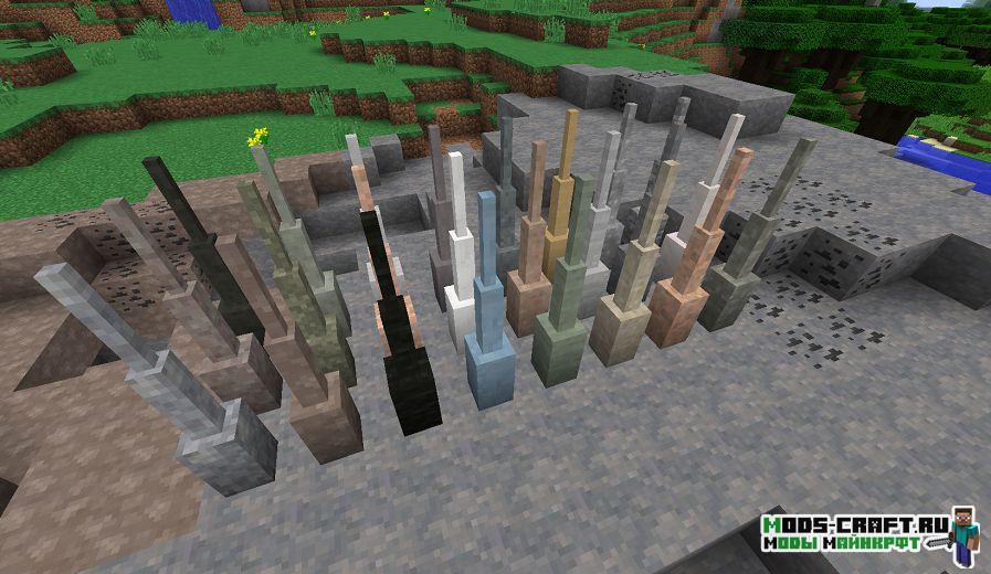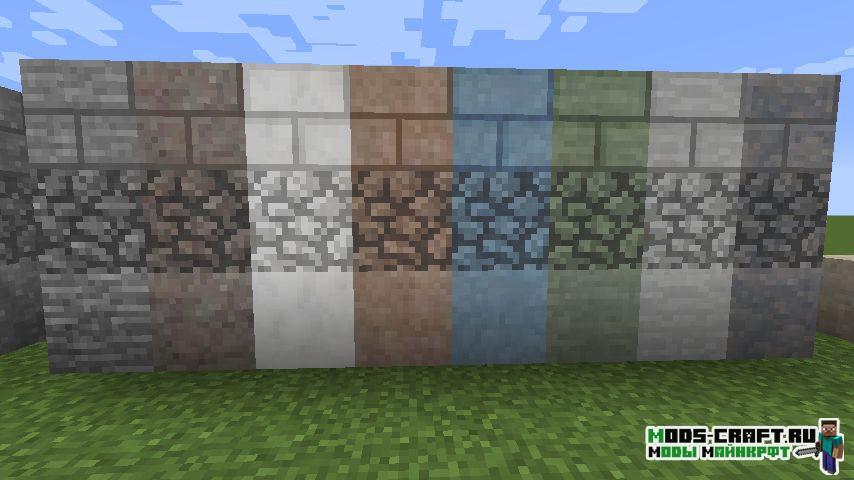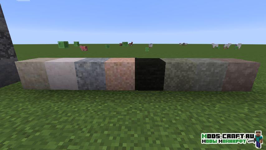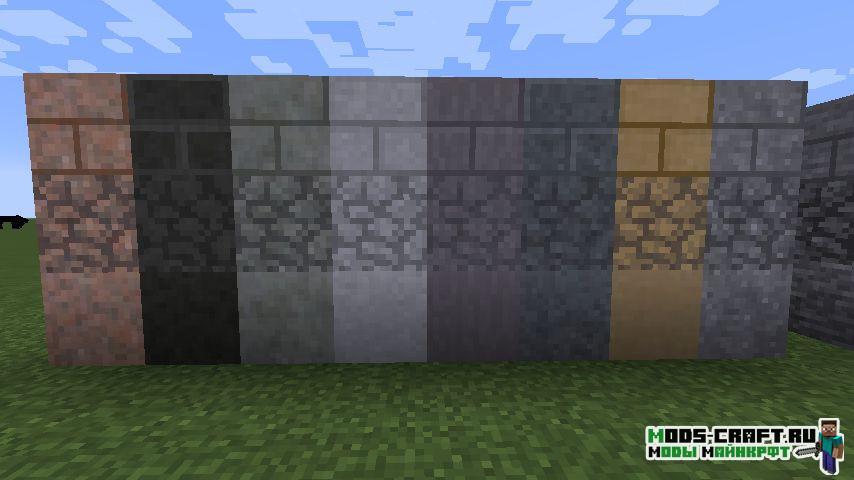 В игре теперь будет доступно больше вариации блоков камней, а именно 24 различных видов камней, 24 видов пеской, 16 видов булыжника. Кроме этого для всех этих блоков можно делать ступеньки, лестницы и стены.