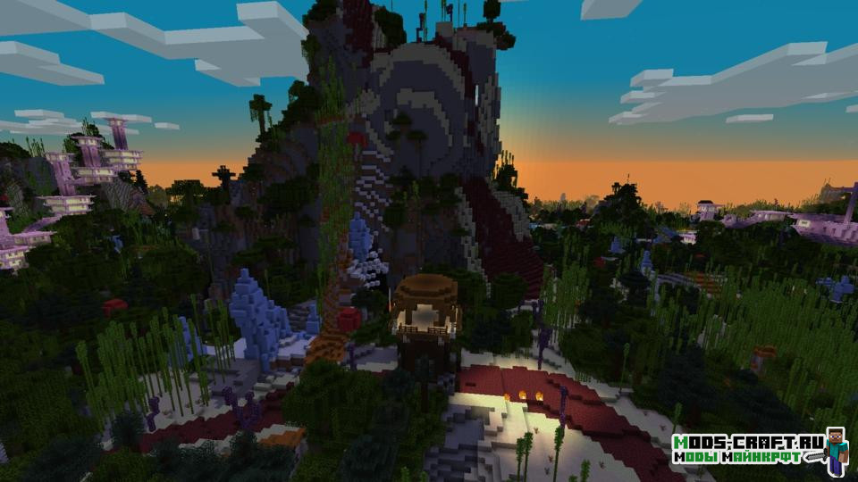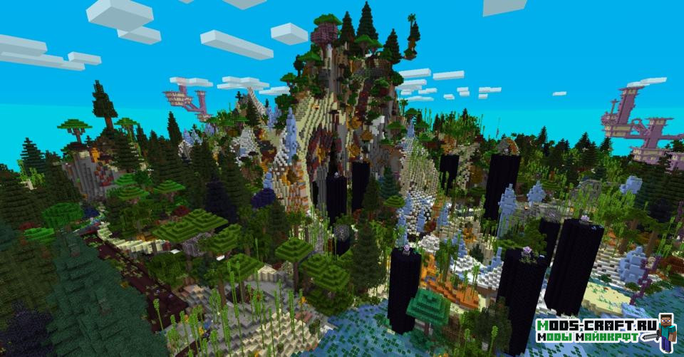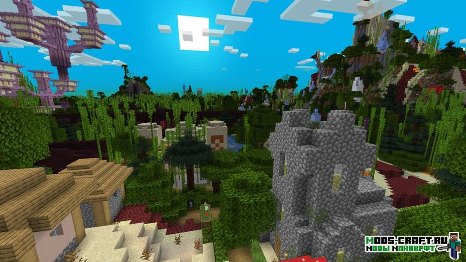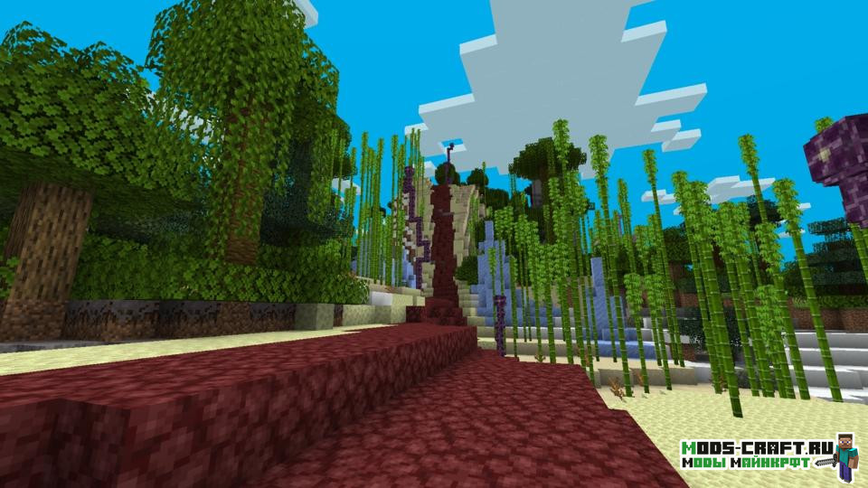 Мод добавит новое измерение, наполненное различными структурами, пещерами и объектами различных биомов. Чтобы попасть в данное измерение необходимо разместить 8 сундуков рядом в формате 2х2х2 и заполнить их каким-либо одинаковым блоком.
