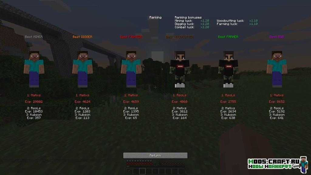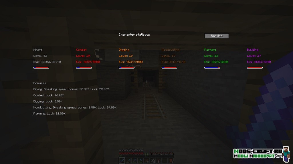 Мод ZmodSkills позволяет Вам прокачивать своего персонажа в игре Майнкрафт в шести направлениях: шахтёр, копатель, боец, дровосек, фермер, строитель. Повышение каждого класса навыка повышает характеристики персонажа в своём направлении.