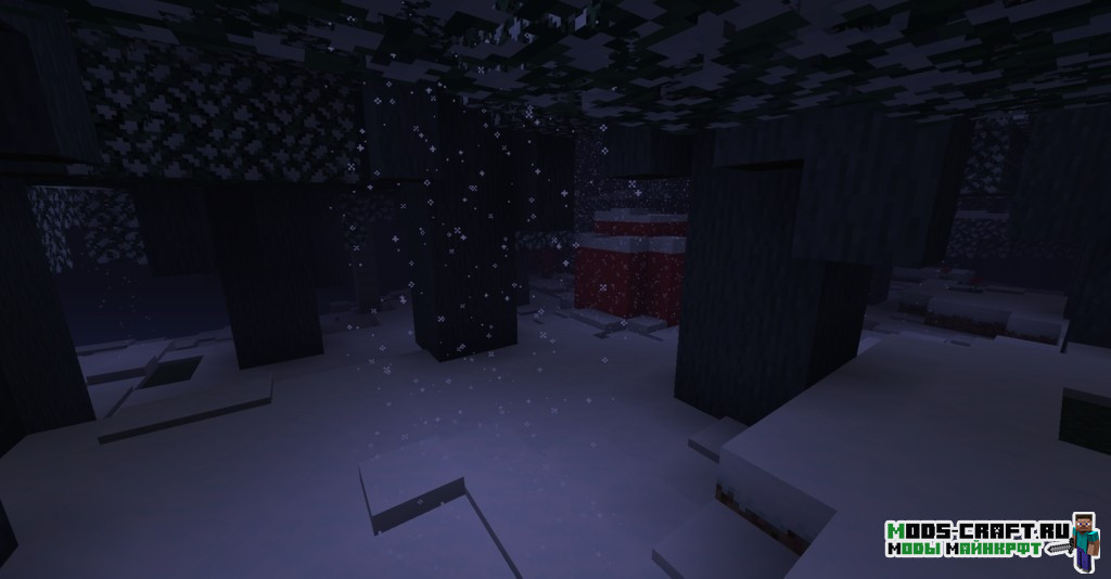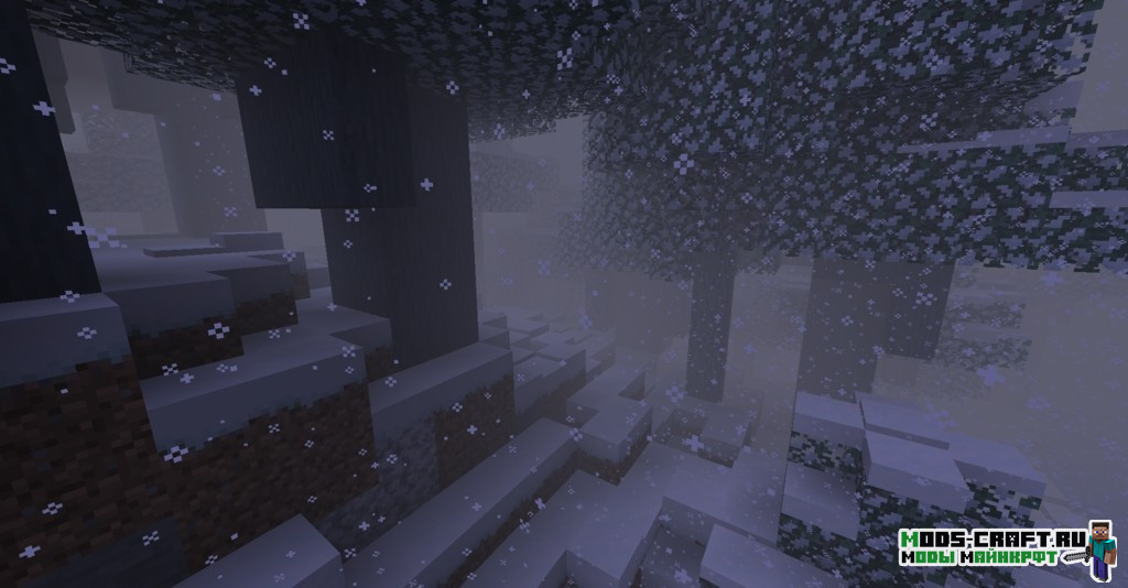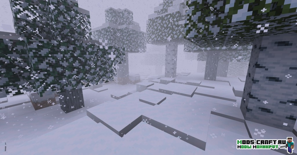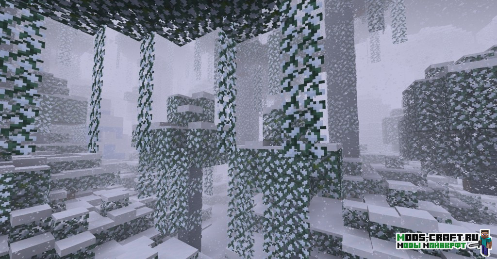 - Работает автоматически с любыми другими модами, которые добавляют новые биомы, принудительно преобразуя их в зимние версии.