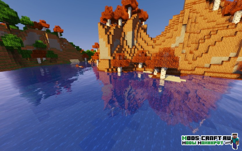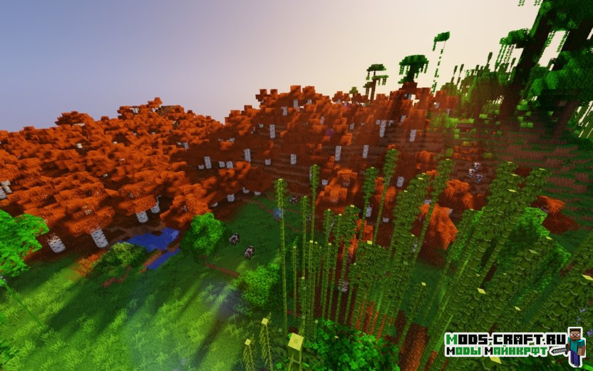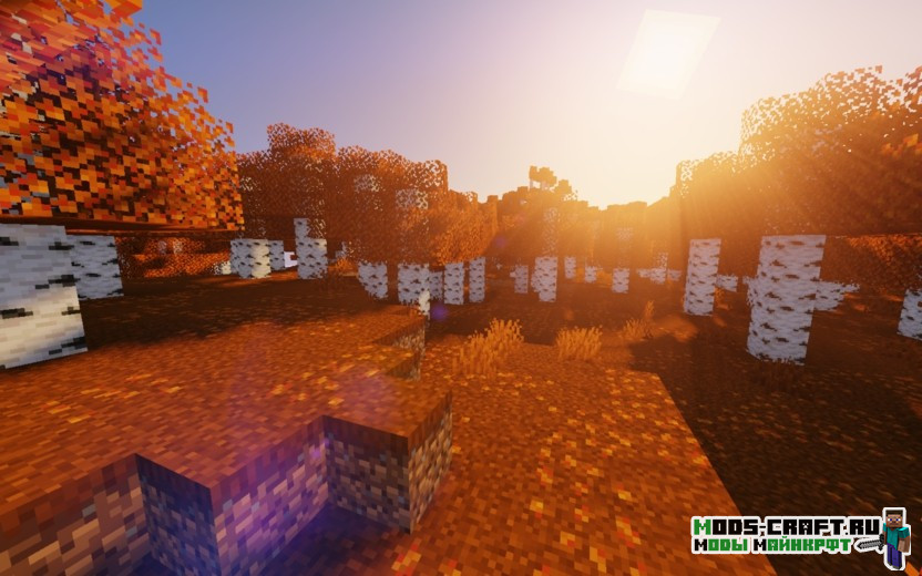 Установив данный ресурспак березовые леса станут осенними: с оранжевой травой, красными деревьями и опавшими листьями, разбросанными по земле. Автор хотел разнообразить игру новой атмосферой осени и у него это получилось. Чтобы работала листва на земле, необходим Оптифайн, но можно использовать текстуры и без него.