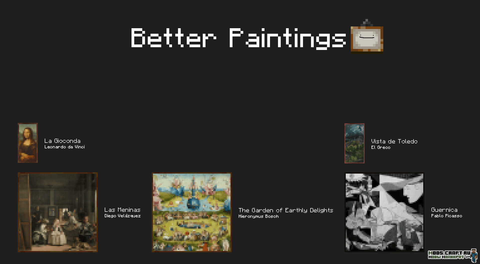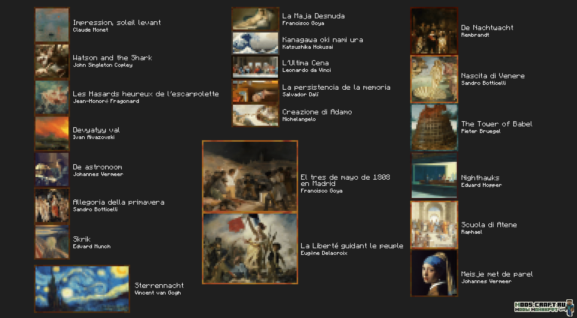 Ресурспак заменяет ванильные картины на реальные произведения искусства. Укрась свой дом известными картинами Леонардо Да Винчи, Моне, Пабло, Дали и другими.