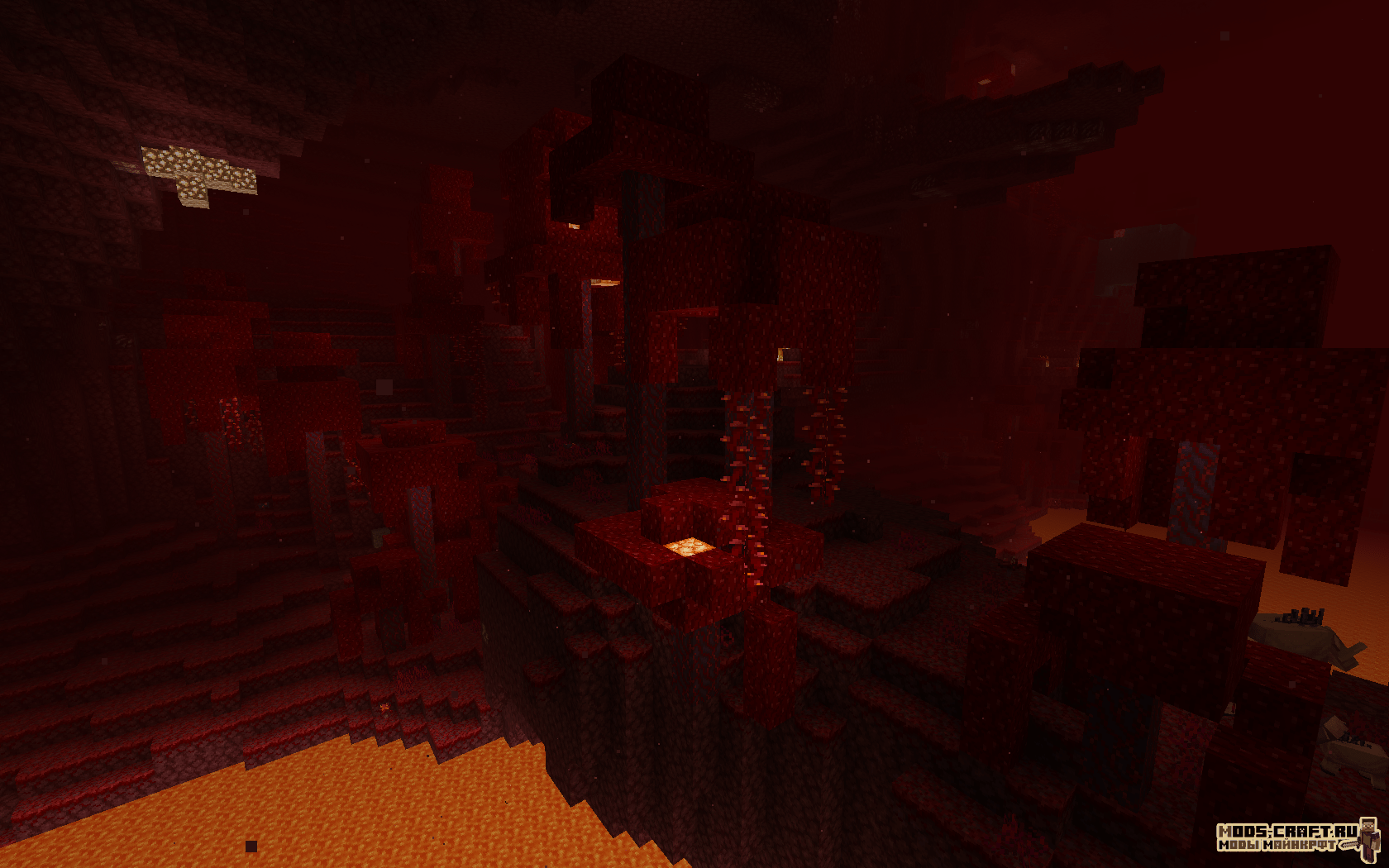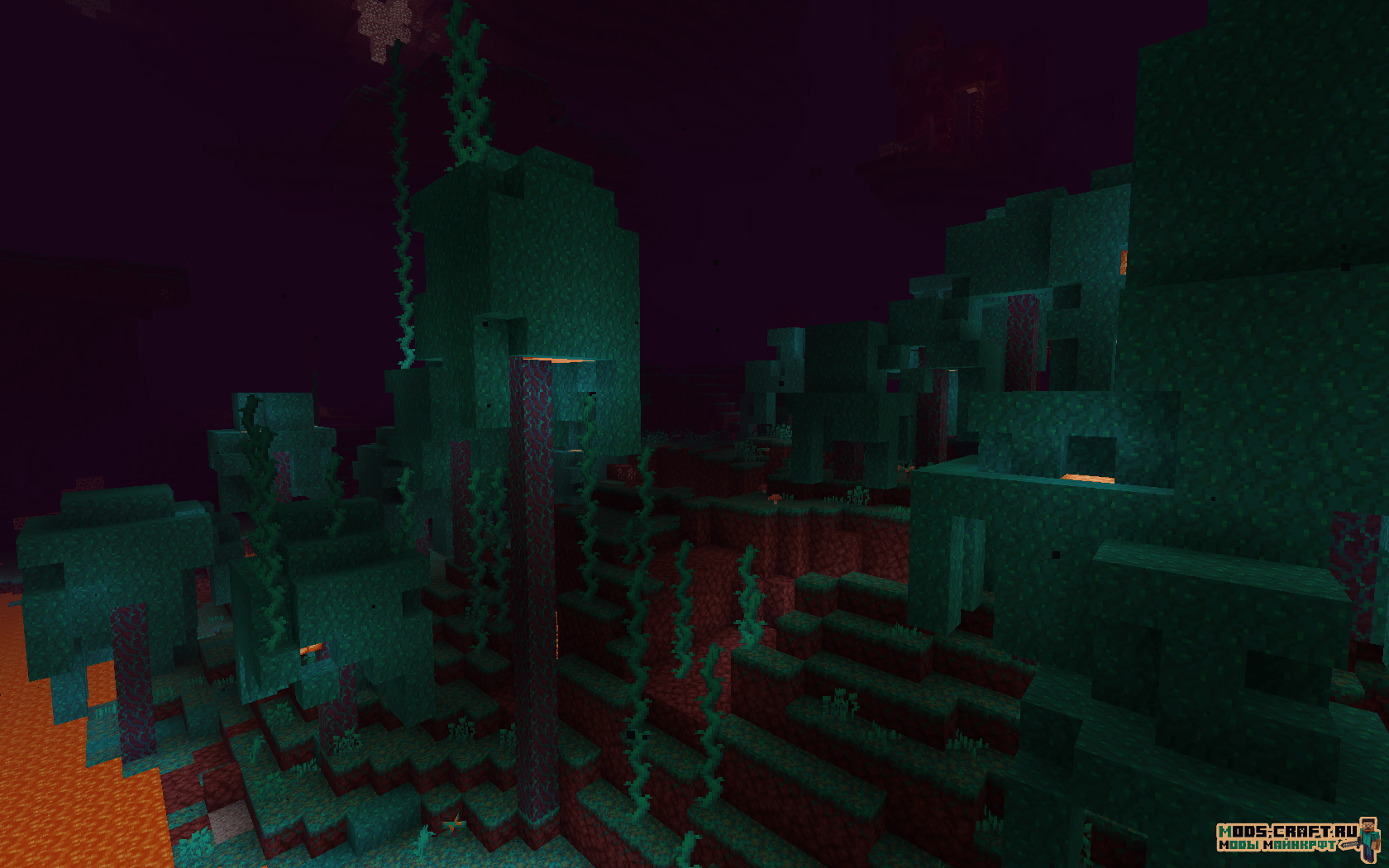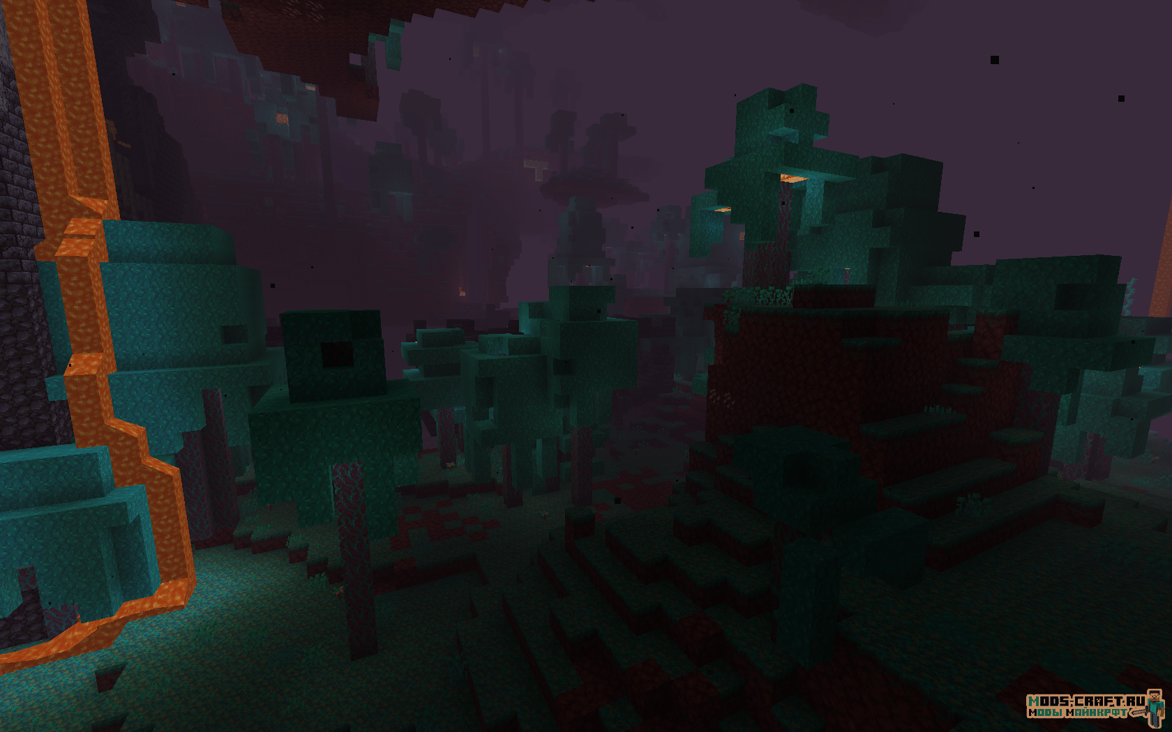 - Багровый лес — Густой лес с большими багровыми грибками и красным туманом. Обитаемые мобы: Пиглины, зомбифицированные пиглины и хоглины.