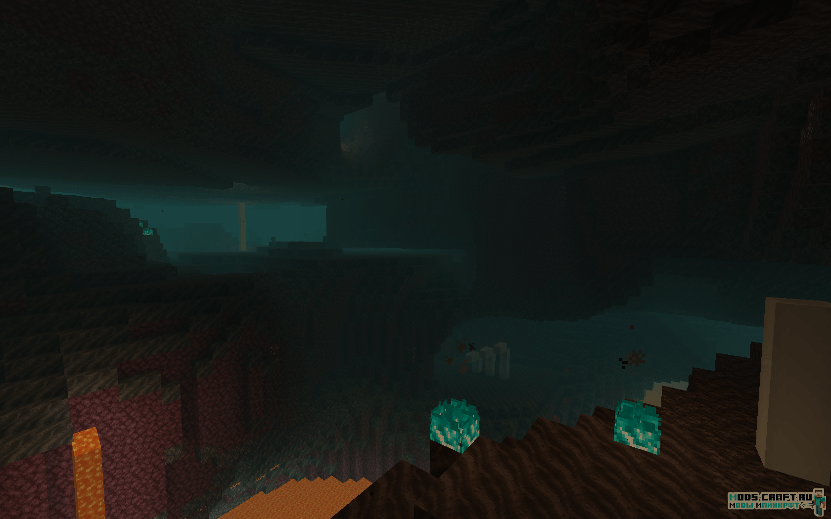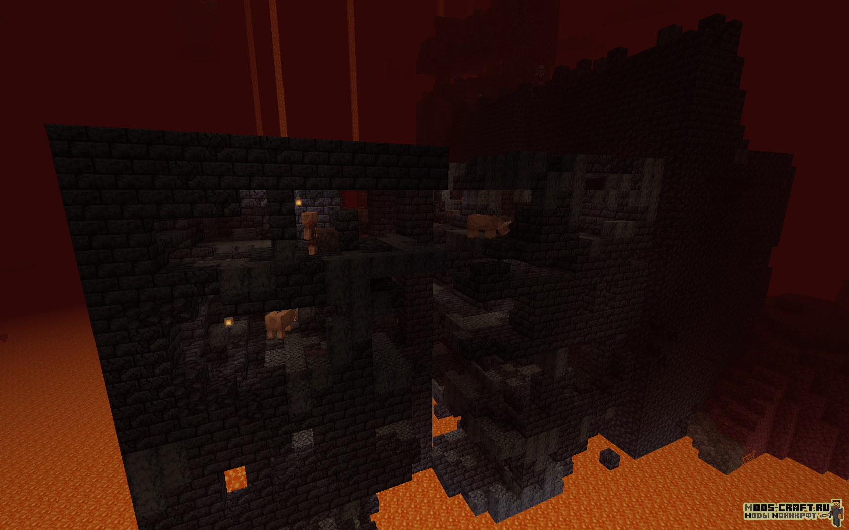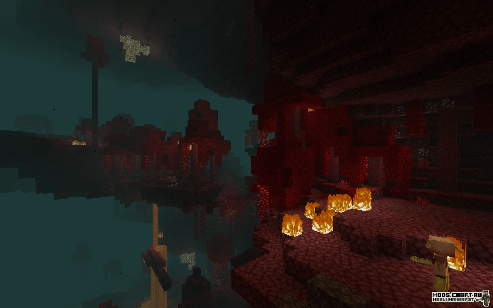 - Багровый лес — Густой лес с большими багровыми грибками и красным туманом. Обитаемые мобы: Пиглины, зомбифицированные пиглины и хоглины.