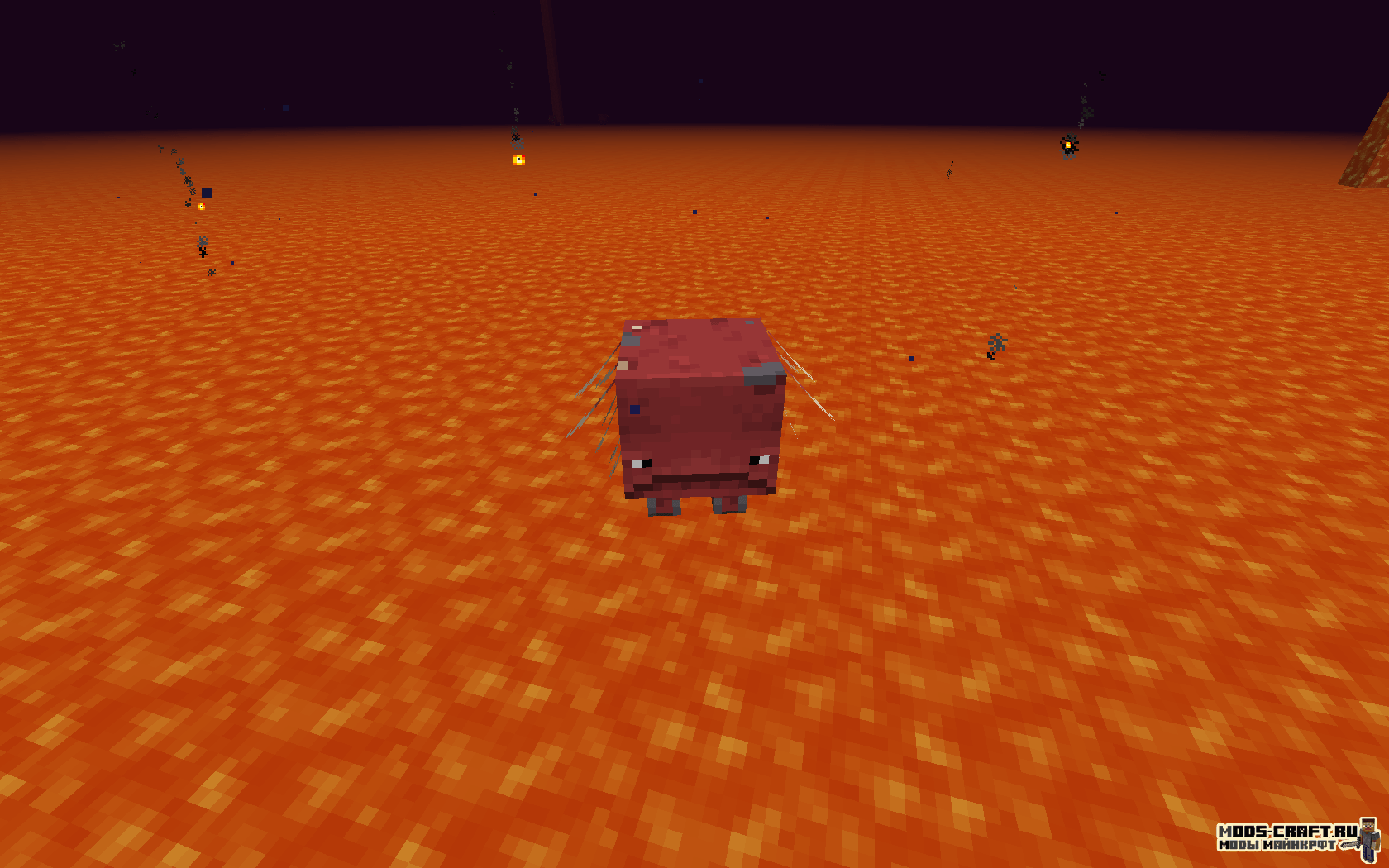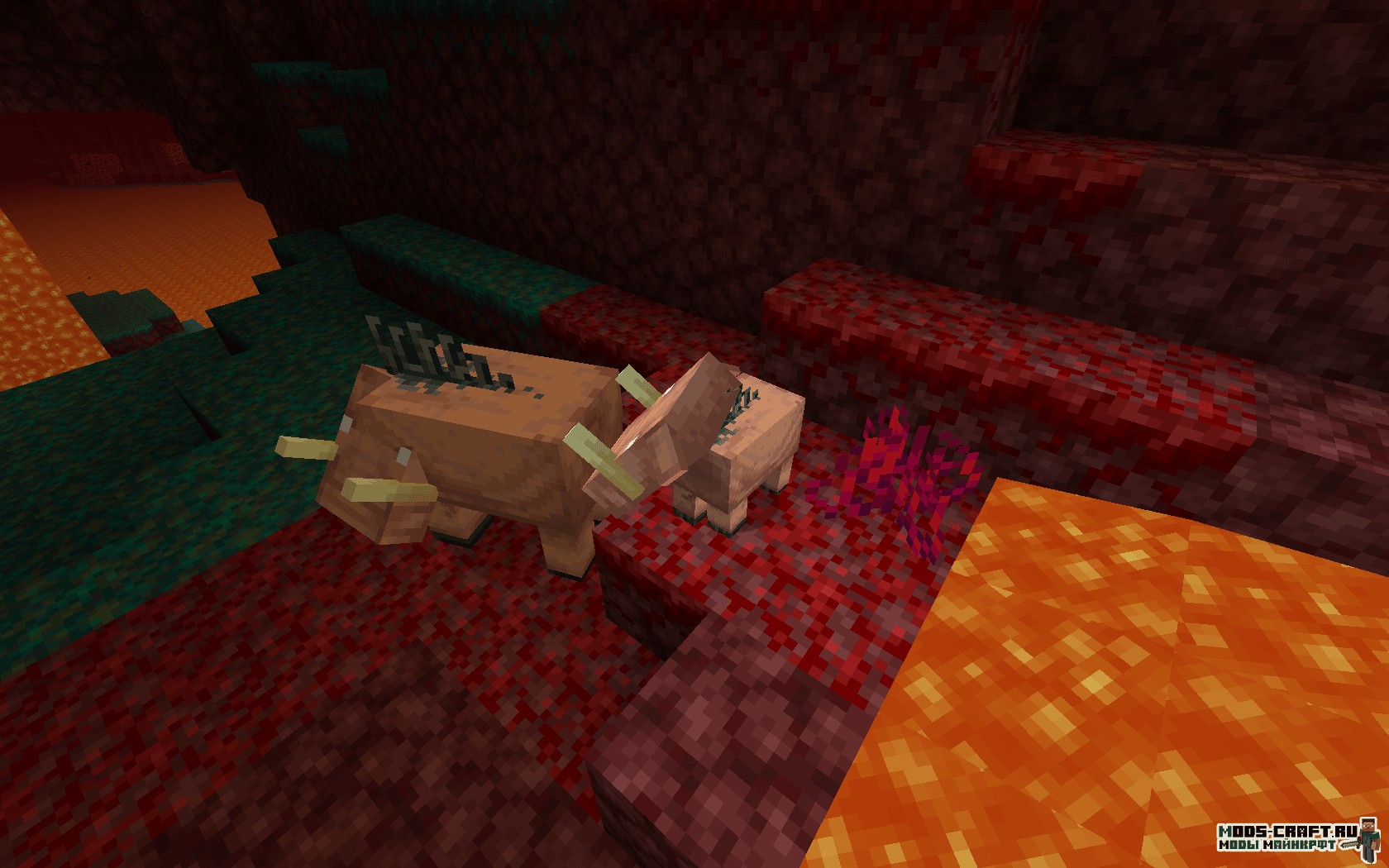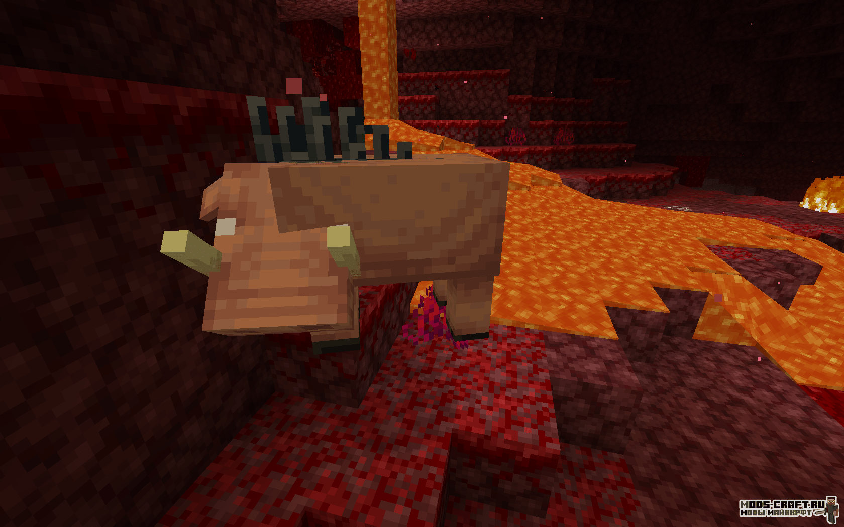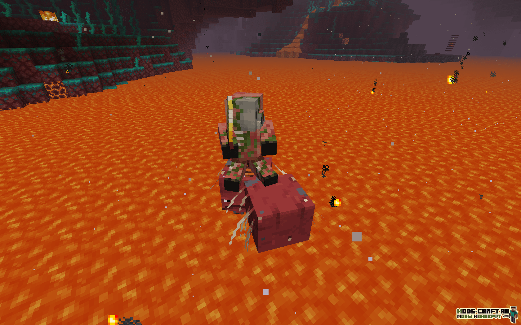 - Страйдер — обитает на поверхности лавового океана нижнего мира, можно оседлать и управлять с помощью удочки с искаженным грибом. Моб разводиться искаженным грибом. Вне лавы будут чувствовать себя некомфортно — дрожать и изменять цвет на серо-фиолетовый, а обычная вода и вовсе может его убить. Может заспавниться с с зомби-пиглинами или маленькими страйдерами в качестве наездников. С него выпадает дроп в виде ниток (от 2 до 5 штук).