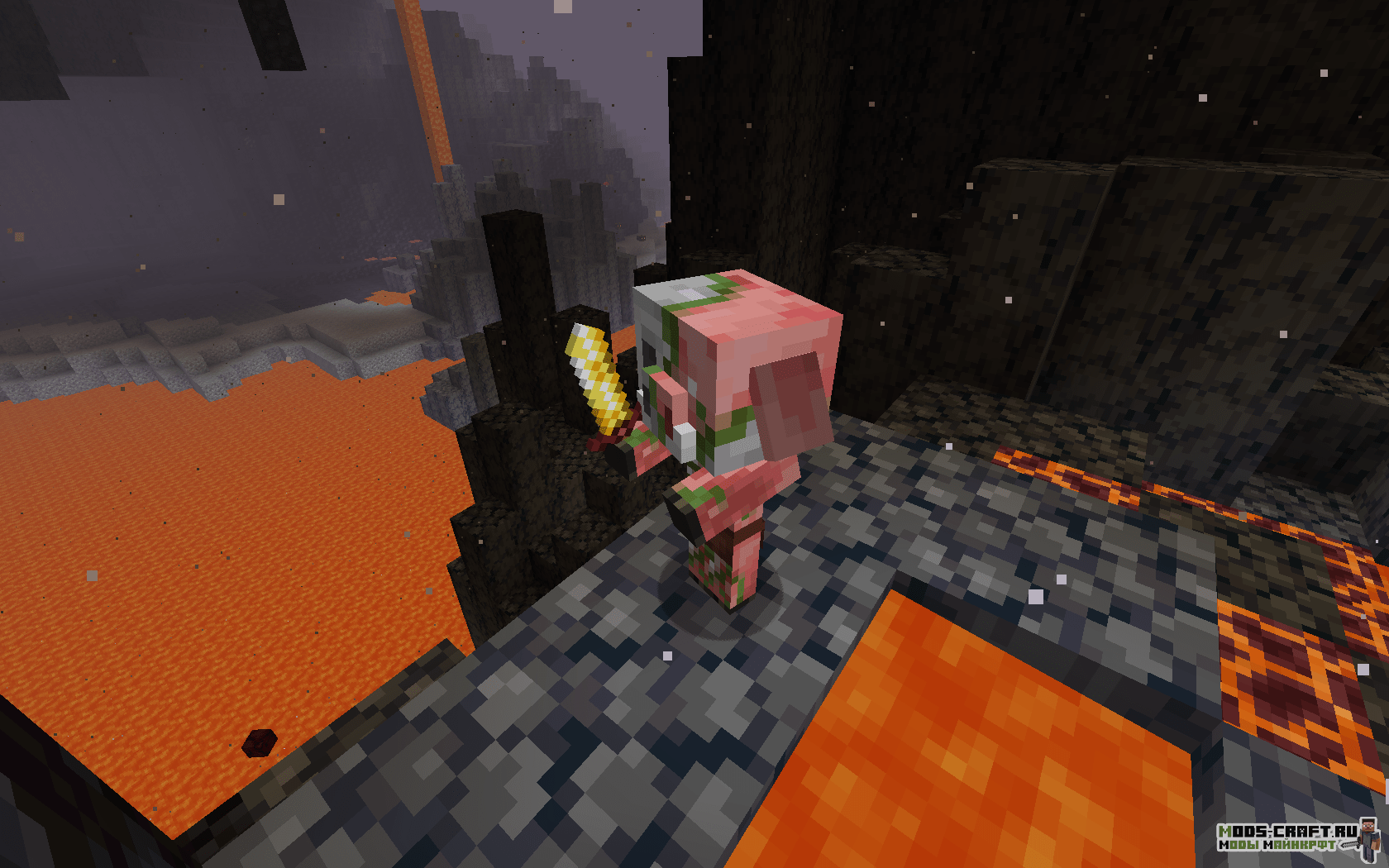 - Пиглин — свинья с человеческим обличием, будут атаковать игрока при добычи им золота или открывании сундука. Одев золотую броню, они примут вас за своего. С ними можно торговать с помощью золотых слитков. Имеет 16 очков здоровья. Имеет малый шанс дропнуть после смерти золотую броню или оружие.