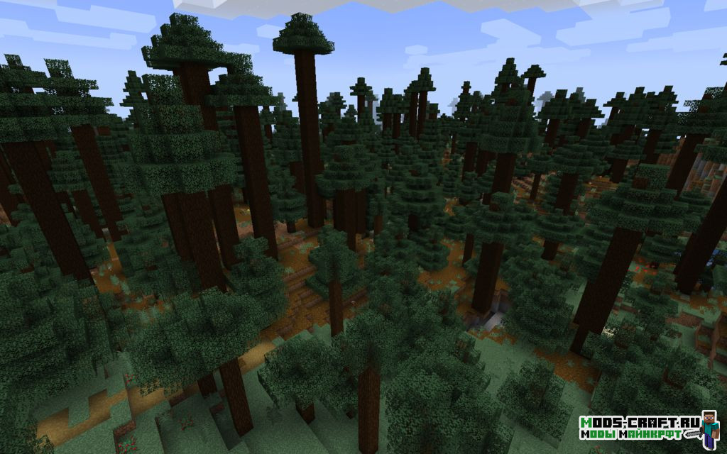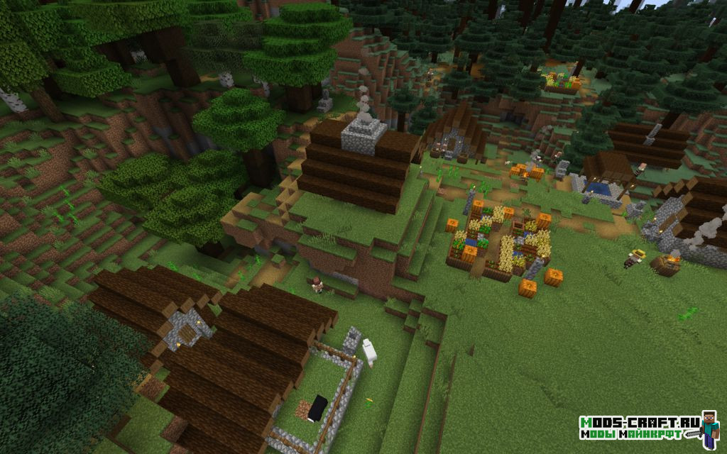 Вы появитесь в тайге рядом с большой деревней. Тут же неподалёку расположен редкий биом — тайга с гигантскими елями.
