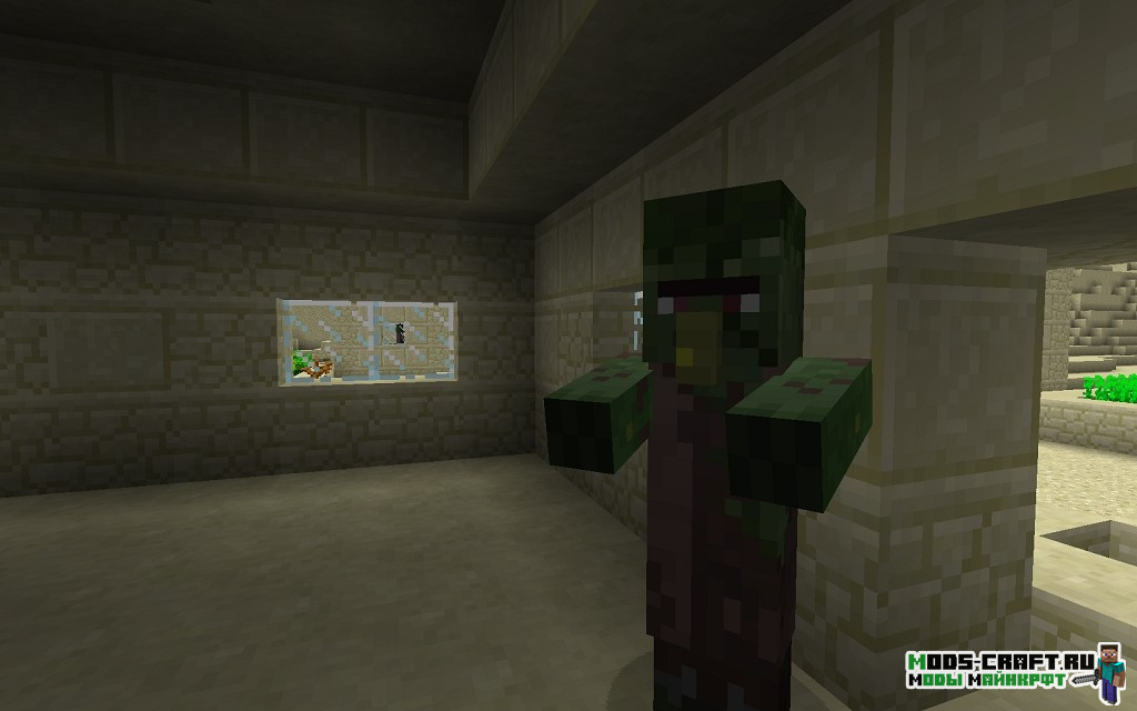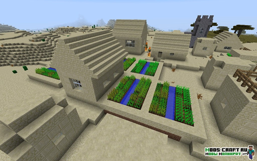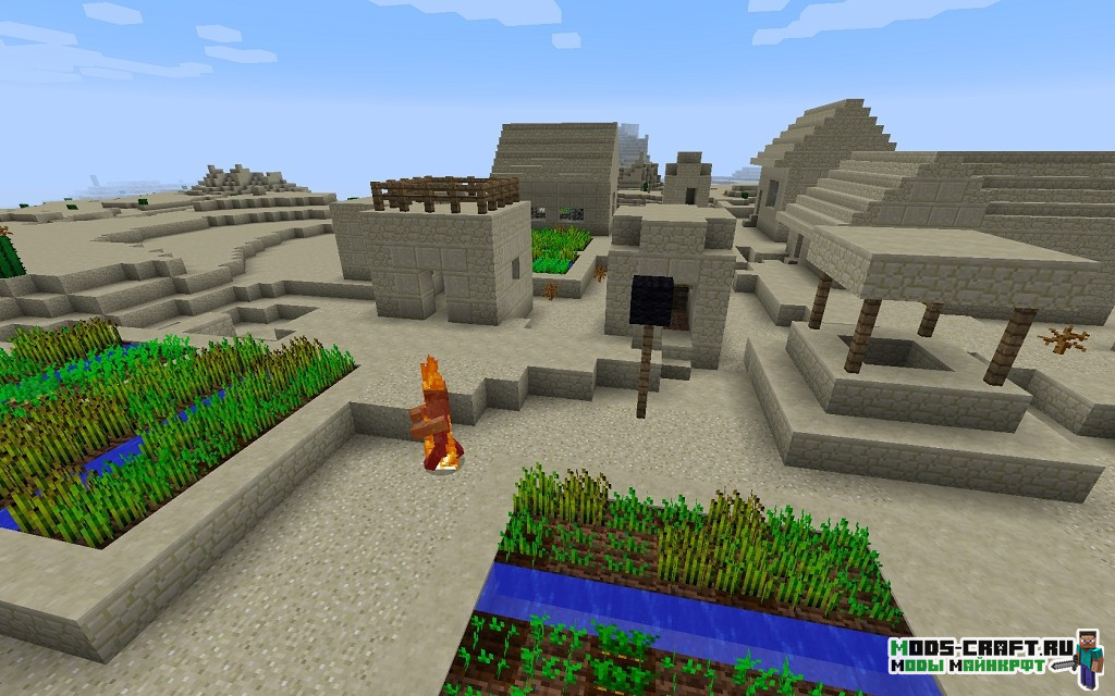 Вы спавнитесь прямо перед деревней в пустыне, но не обычной, а зомби-версией. Как ни странно, здесь много посаженых культур, имеется церковь, кузница и довольно много полезных ресурсов. Если идти дальше, то совсем рядом можно отыскать храм в пустыне (его координаты 138, 65, 186).